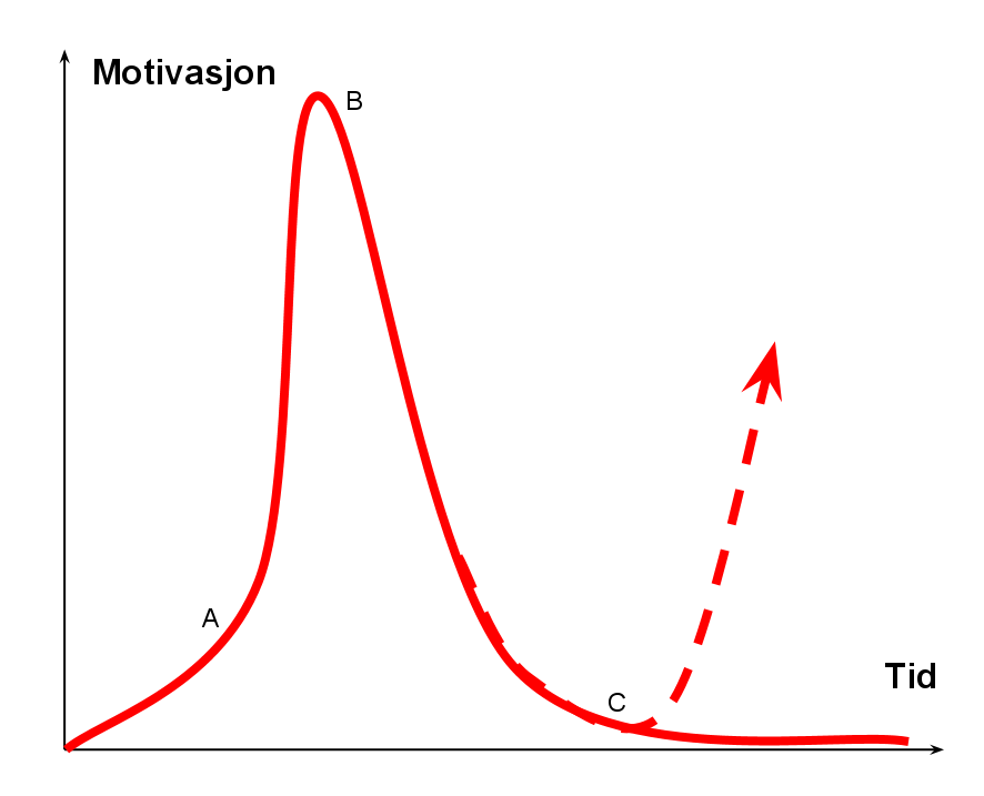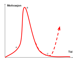 - B: En er i gang med å lese sine første par bøker om emnet (etc.), og motivasjonen går rett til værs. En føler seg raskt som en av «de innvidde», og har alt meldt seg inn i sin første forening, samt flagget sin interesse høyt og skingrende for alle som vil høre. Sliter med å konsentrere seg om noe som helst annet.