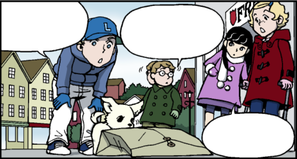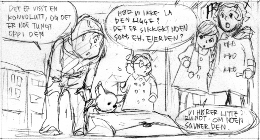 I første omgang skal jeg skrive en historie i seks deler à én side, og har spunnet en liten detektivhistorie der barna må spore opp eieren av en mystisk konvolutt de finner på gaten. Underveis har jeg også klart å skrive inn noen elementer som står hjertet mitt nært, en av de store gledene ved å skrive historier. Tegneserien tegnes av de to japanske damene Kanako og Yuzuru, som blant annet tegner de grafiske romanene i Alex Rider-serien. Den vil bli publisert høsten 2011 over seks utgaver av medlemsbladet Barnas, som går ut til alle Søndagsskolens medlemmer. Over kan dere se en work-in-progress-rute fra seriens første episode.