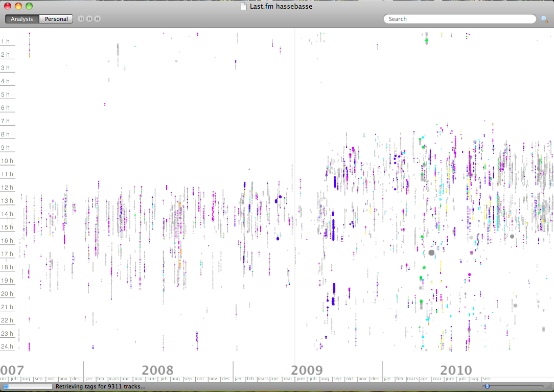 Virkelig next level-nerding blir det imidlertid først med LastHistory, et program for mac som gir deg en visuell fremstilling av hele din last.fm-historie. Ved å bevege muspilen over de fargede punktene dukker det opp navn og informasjon på hver enkelt sang, med forgreninger til de alle andre forekomstene av sangen i historien din. Programmet integrerer med iTunes så du kan lytte til sangene direkte, mimre om hva du hørte på sist sommer, enkelt se når på døgnet du hører på ulik musikk, snuble over den gruppa du hørte på mens du var på den Tokyo-turen for tre år siden osv osv. Artig for unga, særlig siden programmet er veldig lekkert designet.