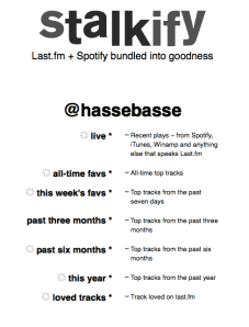 Men dette er altså bare begynnelsen, det er her den virkelige nerdingen begynner. Noen glupe mennesker har nemlig kommet på muligheten for å sy sammen last.fm med streamingtjenesten Spotify. Det kuleste resultatet er Stalkify. Her kan man taste inn brukernavnet sitt på last.fm og få ut en rekke spillelister generert på bakgrunn av statistikken sin: Mest hørte låter, mest hørt i det siste, sanger man har trykket «love» på og mange andre. Tjenesten er noen ganger litt buggete, blant annet tar det ofte lang tid før spillelistene genereres, og noen sanger jeg iallfall aldri har hørt på dukker plutselig opp, men ellers er tjenesten glimrende. Like kult er forresten Discoverfy som bruker statistikken på last.fm (ikke bare din egen) til å generere Spotify-spillelister med artister som likner på en valgt artist.