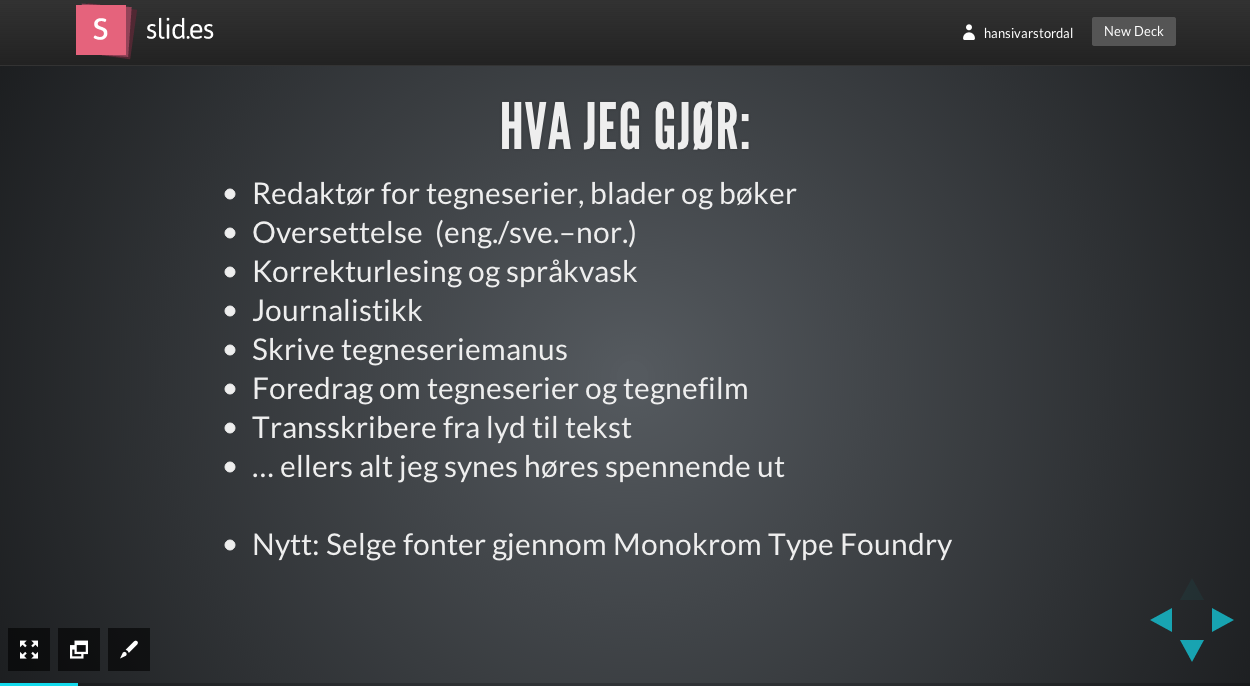 På sikt håper jeg verktøyet åpner opp for full stylesheet-redigering av egne maler. Ikke minst ville det vært gledelig å kunne bruke egne webfonter, i det aller minste via tjenester som Typekit etc. Men Slid.es er fortsatt i sin barndom, så trolig vil det skje mye fremover. Jeg skal iallfall følge med, for den ene presentasjonen jeg brukte verktøyet til, fungerte som en drøm.