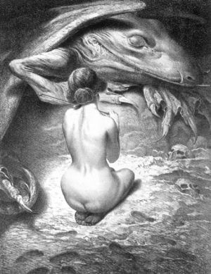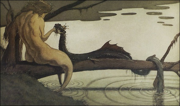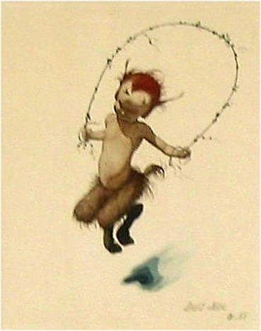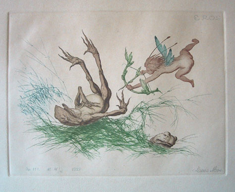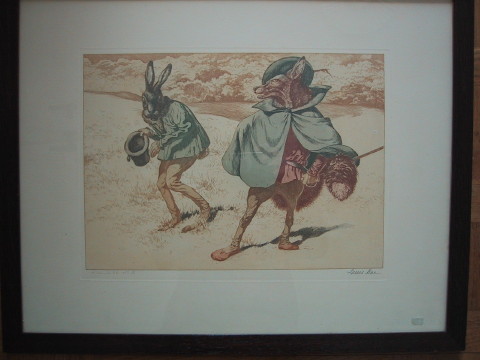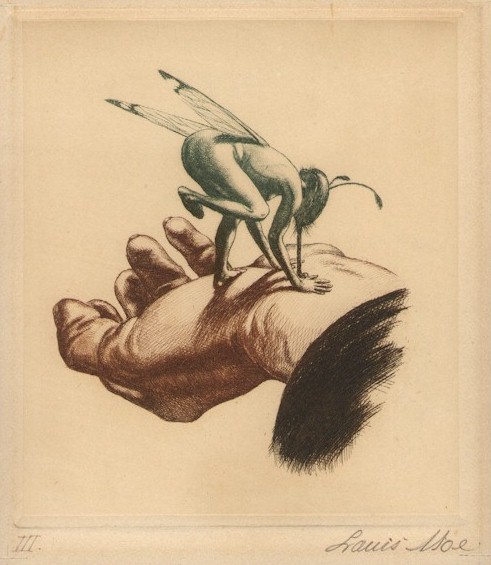 Louis Moe tegnet for øvrig slett ikke bare i funny animals-stil. Mange av illustrasjonene hans, som noen i utvalget over, er i et langt mer mytisk og nasjonalromantisk landskap à la Kittelsen, med alver, feer, drager og andre elementer som i dag ofte får merkelappen «fantasy» (en betegnelse som selvsagt er av mye nyere dato). Noen av illustrasjonene har også et mildt erotisk tilsnitt. Han viser i mine øyne en sterk evne til å vekke mange av stemningene og skikkelsene fra folkediktningen til live på en frisk og personlig måte. Moe har imidlertid havnet ganske i skyggen av Kittelsen i ettertid, uvisst av hvilken grunn. De to delte for øvrig en utstilling i Arendal, Moes fødeby, for noen år siden. Ellers har det faktisk vist seg ganske vanskelig å finne noe særlig av Moes illustrasjoner eller egne bøker i nyere utgivelser, med unntak av et par av hans barnebøker som Samlaget ga ut på nittitallet. For å se et bredt utvalg av illustrasjonene hans i ulike stilarter vil jeg anbefale boken det er bilde av over, Louis Moe og hans kunst (1949), en paperback som ennå finnes på Deichmanske bibliotek.