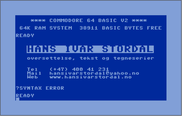 Forkastet versjon 1: Dette var lenge min personlige favoritt – bare synet av denne skjermen vekker så mange gode følelser i meg. Jeg er også ganske fornøyd med den nøyaktige gjenskapningen, og det faktum at det (til tross for litt juks med den store, inverterte skriften i navnet) faktisk skulle være mulig å få frem nøyaktig dette skjermbildet (bare i 4:3-format) på den gamle boksen. Men tross dette: Det ble litt for mye skrift som ikke tjener formålet med et visittkort, og noen forsøk viste at alderssegmentet der jeg kunne forvente at folk forstod referansen i beste fall strakk seg fra 25–40. Og enda mer grunnleggende: Det er jo faktisk ikke dataspill jeg jobber med, selv om jeg kanskje skulle ønske det. Rett på den digitale skrahaugen med det!