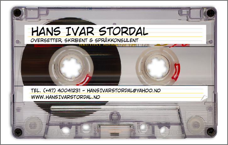 Forkastet versjon 2: Jeg likte godt ideen om å la visittkortet representere et velkjent fysisk objekt, så jeg lagde denne skissen. Hadde jeg gått videre med ideen, ville jeg nok ha håndskrevet teksten på etikettene og fått selve etikettene til å se enda mer «fysiske» ut. Tanken var å kanskje stanse kortet med avrundede hjørner og legge spottlakk på selve kassetten. Men til syvende og sist strandet også dette på selve relevansen – jeg driver ikke akkurat noe særlig med musikk lenger, og hva i innerste granskauen har da en kassett med noe som helst å gjøre? Unntatt å se kul ut, da, selvfølgelig … FAIL!