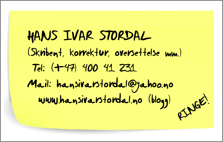 Forkastet versjon 3: Dette er kanskje en litt småteit idé, men jeg liker den like fullt, særlig siden den faktisk sier litt om hva jeg driver med: På slutten av en arbeidsdag kan det ligge og slenge en del slike post-its rundt omkring på pulten. Skulle jeg ha gått videre med ideen, måtte jeg definitivt ha tatt bilde av en ekte lapp, og ikke brukt en tegnet versjon som her. Dessuten hadde det jo vært kulest å skrive på den for hånd, og kanskje inkludere litt mer «telefondrodling» og kanskje et par bokstaver som er klusset over etc. Men til syvende og sist ville det nok blitt for uklart og uleselig, og kanskje drept selve poenget med kortet. (Men å lime en fysisk post-it-lapp på et hvitt visittkort, det hadde vært fett. Bare synd det ville falt fra hverandre og blitt totalt meningsløst.)