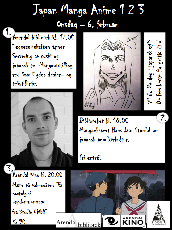 «Japan Manga Anime» er navnet på et arrangement der jeg skal bidra, i Arendal førstkommende onsdag 6. februar kl. 17. Arrangementet holdes på Arendal bibliotek, og er en del av Arendal Vinterfestival. Først skal det serveres sushi og japansk te, holdes cosplay-konkurranse og åpnes en mangautstilling av elever fra design- og tekstillinja på Sam Eyde Vgs. [EDIT: Her er link til elevenes side om mangautstillingen.] Deretter skal undertegnede i ilden med et foredrag om manga, anime og japansk populærkultur. Jeg vil beskrive hvilken rolle manga og anime, tegneserier og tegnefilm, spiller i det japanske samfunnet – verdens mest tegneserielesende land. I tillegg skal jeg prøve å svare litt på hva som er typiske trekk for manga og anime, hvordan disse mediene har utviklet seg som de har, og hvorfor de er så enormt populære i Japan.