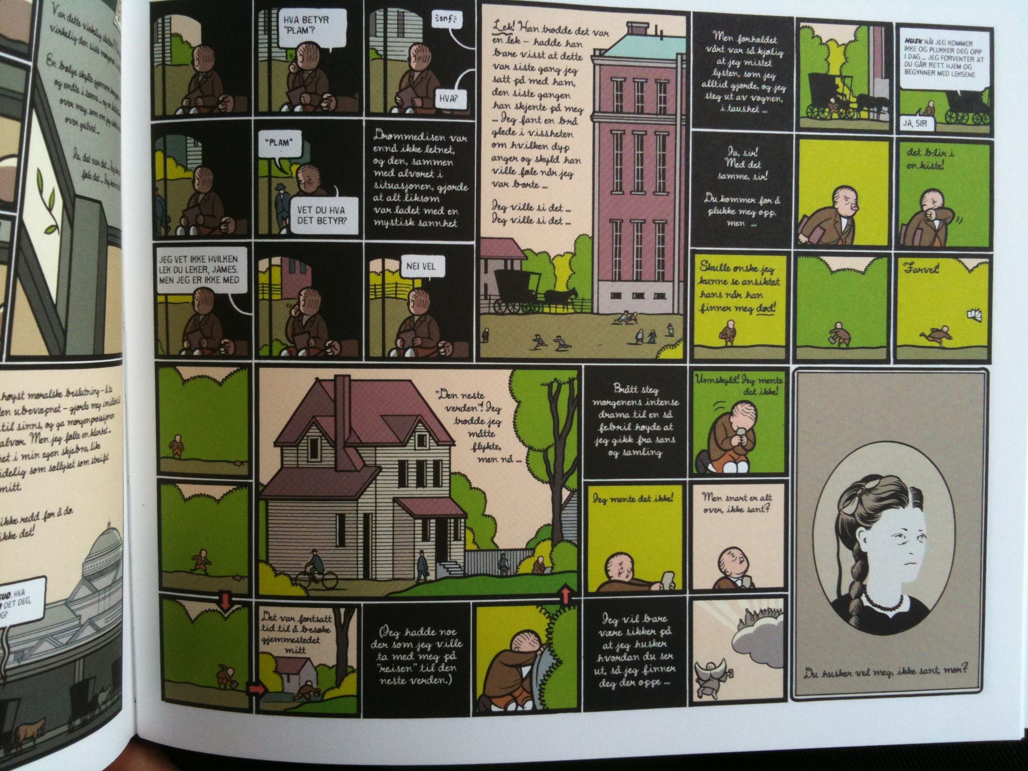 Jimmy er innadvendt, usikker og helt ute av stand til å relatere sunt og normalt til andre mennesker, særlig kvinner. Dette kommer særdeles tydelig fram i historien, siden Jimmy stort sett er ute av stand til å si noe som helst, for ikke å snakke om fullføre en setning. Dette visualiseres nydelig gjennom at Ware bare i liten grad viser bikarakterenes ansikter. Like ofte kuttes hodene fra billedrammene, som for å la leseren se verden gjennom Jimmys skamfulle, nedslåtte øyne. Men om det visuelt sett er en styrke, så er det etter min mening en svakhet for boken som roman (i den grad man kan kritisere den på det premisset – det merkes jo at boken opprinnelig ble publisert som føljetong). I store deler av boken med lot jeg meg begeistre over Wares evne til å skildre stemning og karakter gjennom vart skildrede detaljer i den uforløste og klønete dialogen (som stort sett består i at andre snakker til Jimmy og at han stotrer ufullendte setninger tilbake). Etter hvert som bokens nær 400 sider passerer, synes jeg imidlertid at disse skildringene gradvis mister en del av sin sjarm og stilistiske effekt, og snarere bidrar til en opplevelse av noe litt uforløst. Til å begynne med føles all tausheten nærmest ladet med innhold og spenning, men mot bokens slutt synes jeg boken svikter litt i struktur, helhet og tematisk behandling, for ikke å snakke om karakterutvikling, og ikke helt innfrir den forventningen jeg har til en roman på disse områdene. Og ja, enkelte vil sikkert mene at jeg banner i kirka, eller at jeg dummer meg ut og ikke har forstått at det er dette uforløste og stillestående og antiklimaktiske som nettopp er Wares geniale intensjon … men jeg har mine tvil.