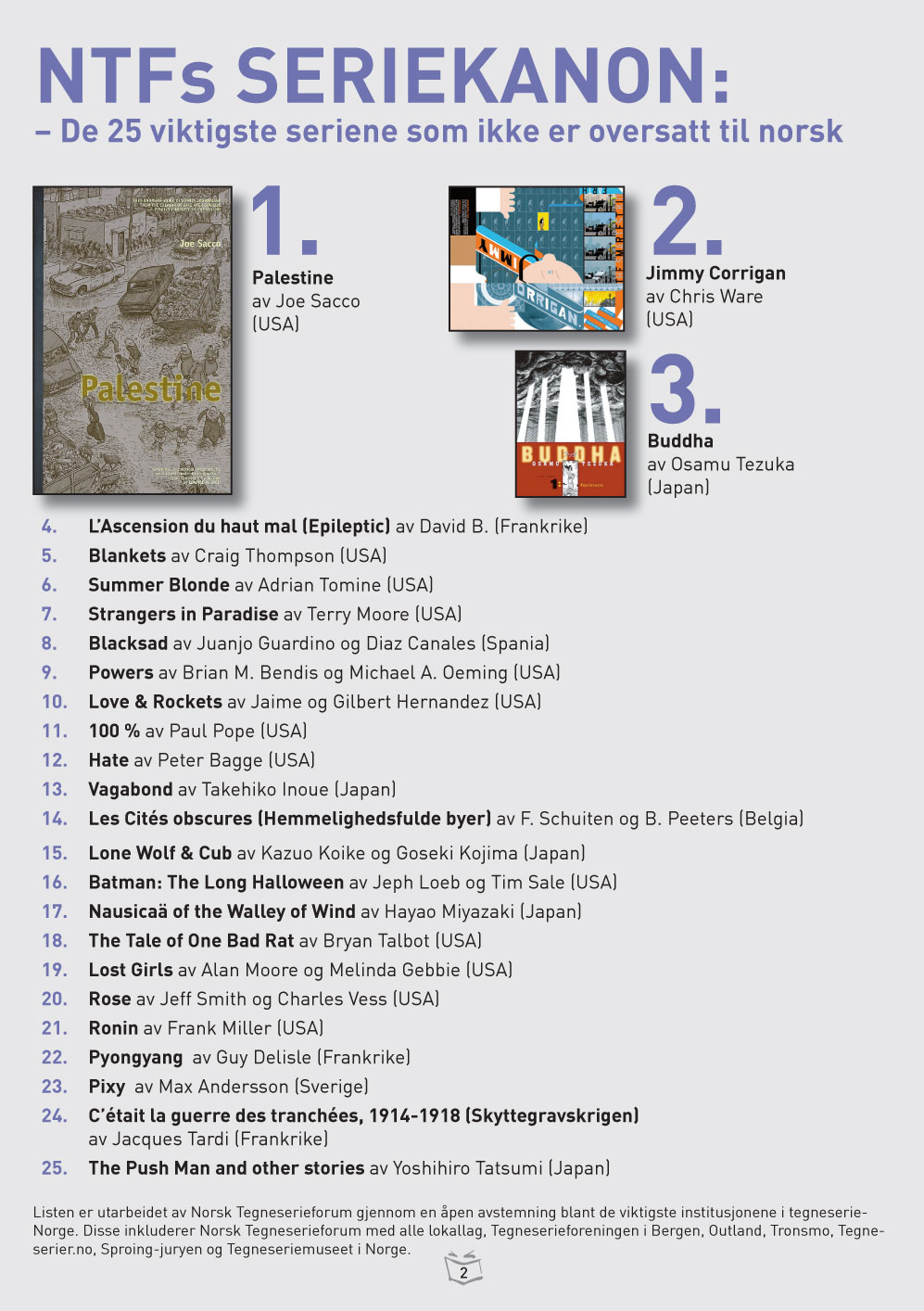 Per i dag er altså disse ti utgitt: 1. Palestine (Palestina) og 3. Buddha på Gyldendal, 2. Jimmy Corrigan og 4. Epileptic (Epileptisk) på No Comprendo Press, 5. Blankets (Tepper), 8. Blacksad og 18. The Tale of One Bad Rat (Eventyret om den slemme rotta) på Egmont Serieforlaget, 22. Pyongyang på Aschehoug og nå altså både 24. Skyttergravskrigen og 25. The Push Man and Other Stories (Kikkeren) på Minuskel Forlag. I tillegg til en lang, lang rekke andre gode tegneserier, så klart. « Read the rest of this entry »