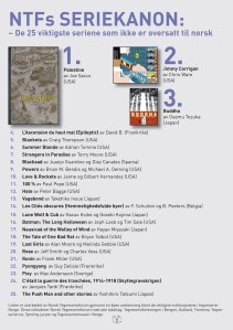 I 2006 tok styret i Norsk Tegneserieforum (som jeg var med i) initiativet til en kåring av verdens 25 beste tegneserier som ikke var oversatt til norsk (se bildet til venstre eller i tekstform nederst)l. Jeg hadde ikke ventet den gangen at drøyt seks år senere ville hele ti av titlene være utgitt på norsk.